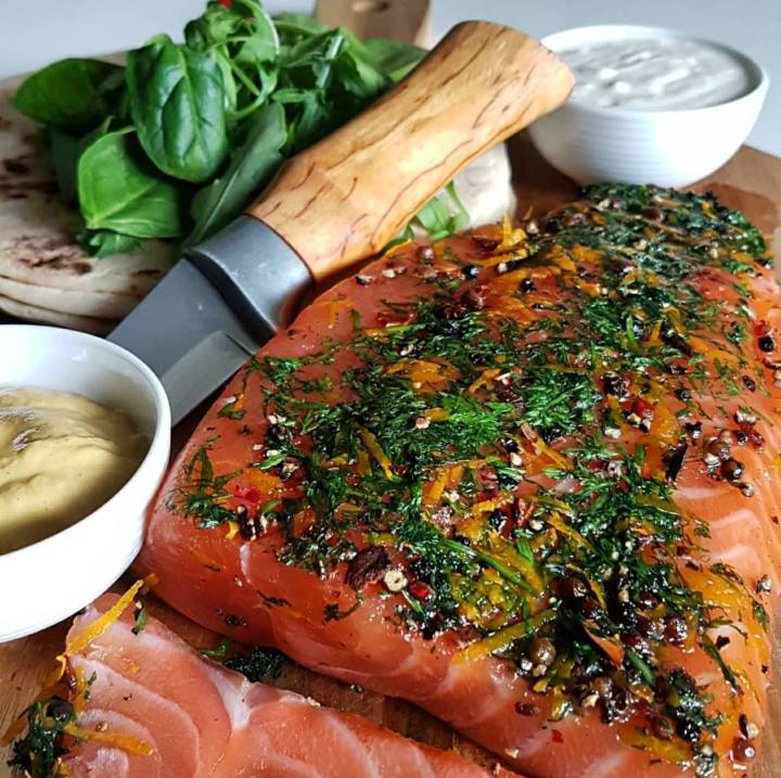 Denne laksen er en skikkelig nydelig norsk variant av japansk sashimi. Sashimi er ganske enkelt rå skiver av laks. Det er egentlig Snikgjest sin egen gravlaks oppskrift med alle de gode og julete smakene, men uten å grave laksen ned i hagen eller å la den ligge til fermentering i kjøleskapet i 3 dager. Et stykke salma laks dekkes med brunt sukker, salt, blandet krydder av pepper, nellik og stjerneanis, revet appelsinskall og finhakket dill. Laksen får så ligge en time innpakket i plast i kjøleskapet, mens du rører sammen en frisk og fin dipp av rømme, pepperrot, sennep og sitronsaft. Skjær laksen i tynne skiver og server i ferske potetlomper med salat og pepperrotdipp. Dette er skikkelig smakfull og sunn middag. Mye smak og enkelt å tilberede.